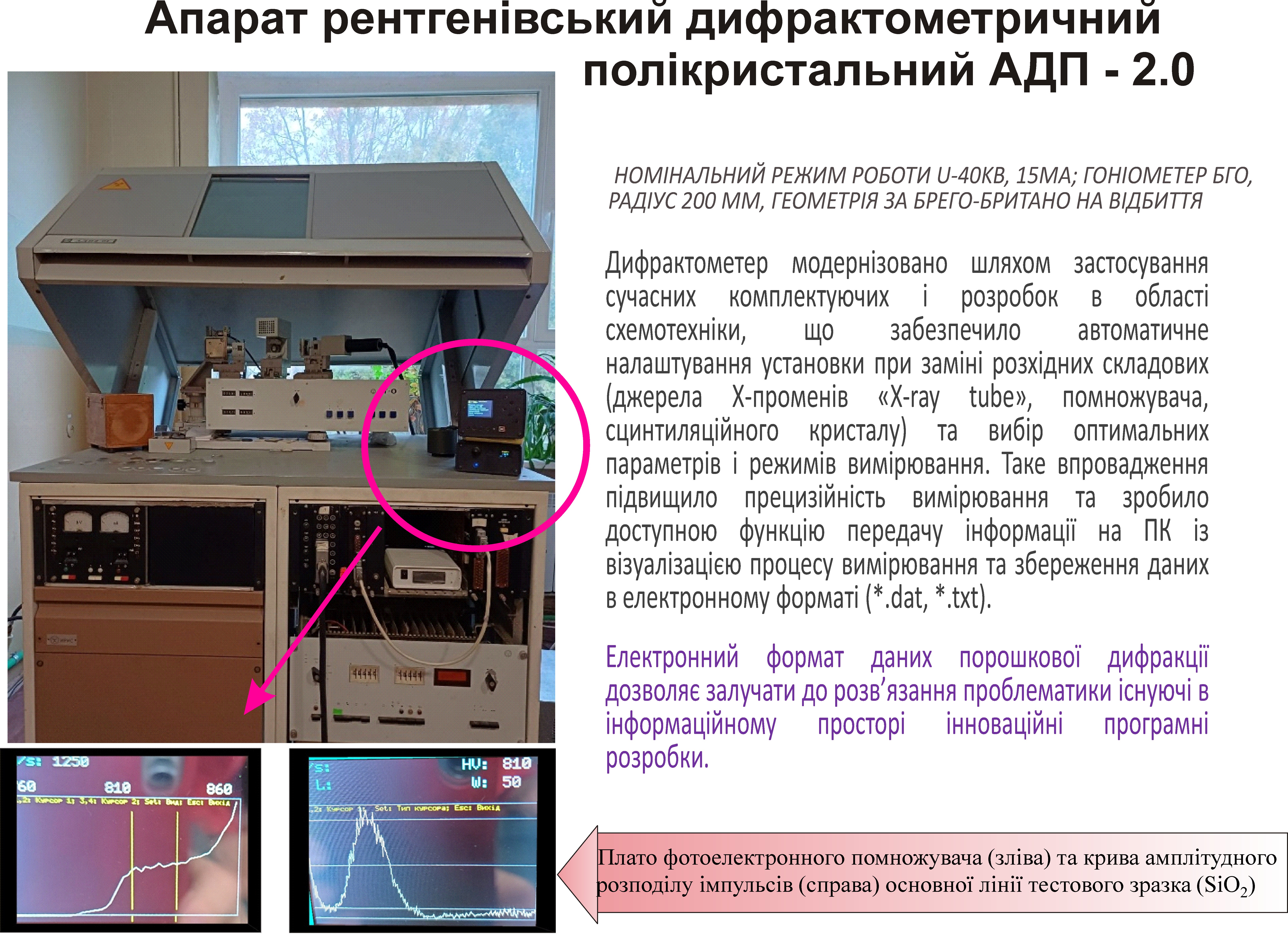 - Обладнання. Використовується установка із джерелами іонізуючого випромінювання: Апарат рентгенівський дифрактометричний полікристальний АДП 2-01 (номінальний режим роботи U-40kB, 15мА; гоніометер БГО, радіус 200 мм, геометрія за Брего-Британо на відбиття). Дифрактометер модернізовано шляхом застосування сучасних комплектуючих і розробок в області схемотехніки, що забезпечило автоматичне налаштування установки при заміні розхідних складових (джерела X-променів «X-ray tube», помножувача, сцинтиляційного кристалу) та вибір оптимальних параметрів і режимів вимірювання. Таке впровадження підвищило прецизійність вимірювання та зробило доступною функцію передачу інформації на ПК із візуалізацією процесу вимірювання та збереження даних в електронному форматі (*.dat, *.txt). Електронний формат даних порошкової дифракції дозволяє залучати до розв’язання проблематики існуючі в інформаційному просторі інноваційні програмні розробки.