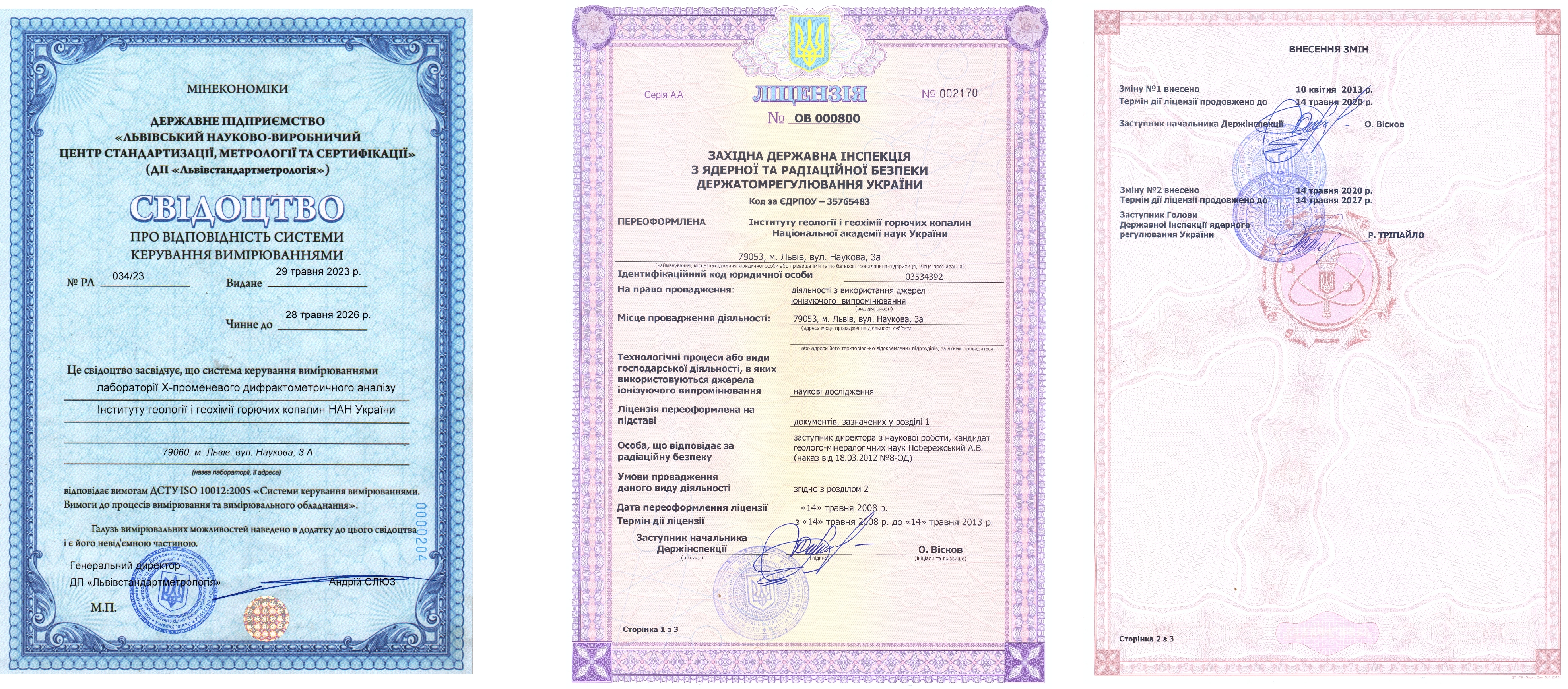 - Лабораторія Х-променевого дифрактометричного аналізу відповідає діючим санітарним правилам і нормам ОСПУ-2005, НРБУ-98 та вимогам ДСТУ ISO 10012:2005 «Системи керування вимірюваннями. Вимоги до процесів вимірювання та вимірювального обладнання» (Свідоцтво № РЛ 034/23 видане 29.05.2023 р., видане Львівським науково-виробничим центром стандартизації, метрології та сертифікації ДП «Львівстандартметрологія») Керується законодавчими актами та нормативними документами, у яких викладені вимоги щодо роботи з джерелами іонізуючих випромінюваннь; статутом ІГГГК НАН України.